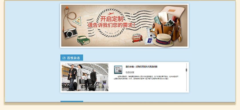 Project Description 百悦逸游于2012年初由二位资深的旅行家创办,是成都传媒集团旗下成都新闻国际旅行社有限公司的高端旅游品牌,总部位于成都高新区天府大道中段美年广场。在百悦逸游成立之前,创始团队亲自到全球三十多个国家实地考察,带着第一手的资讯和执着的信念创立了中国西部第一家真正意义上的私人定制旅行机构。百悦的旅行不是跟团挤大巴,不是十天去十个国家,更不是没完没了的... Official website address 大连http://www.100.travel I want to share